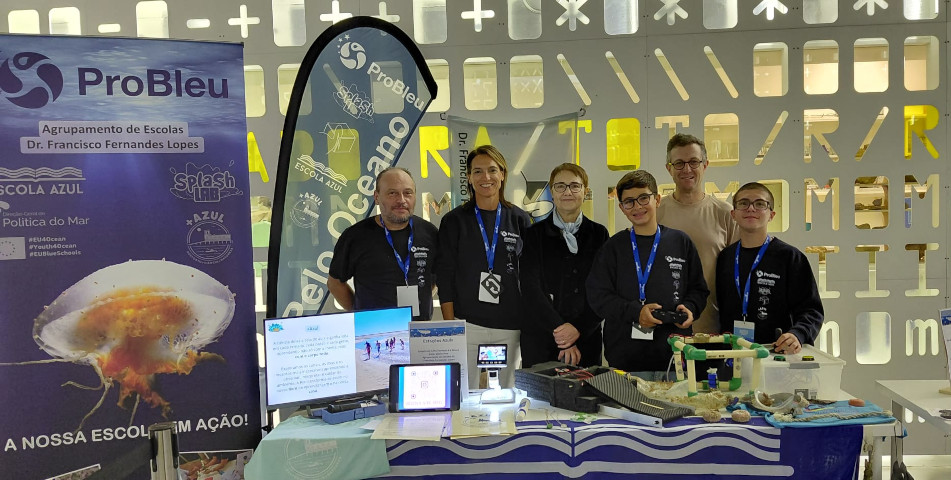 Na banca da escola, exposta no átrio do pavilhão, os alunos explicaram com entusiasmo parte do trabalho do projeto SplashLab / ProBleu: desde as atividades de exploração da Ria Formosa pelo +Azul - incluindo as atividades de observação, mergulho e batismo de vela — até à apresentação da tecnologia produzida no Clube de Robótica XL, com o barco limpador de superfície de água e um ROV subaquático. Ciência e robótica a mostrar, na prática, como cuidar do ambiente.